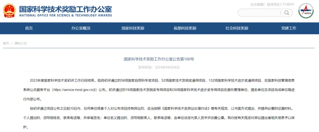 4月8日,国家科学技术奖励工作办公室公告第100号发布。根据公告,初评通过的59项国家自然科学奖项目、52项国家技术发明奖通用项目、132项国家科学技术进步奖通用项目在国家科技管理信息系统公共服务平台公布。初评通过的19项国家技术发明奖专用项目和39项国家科学技术进步奖专用项目在委托管理单位、提名单位及项目完成单位等进行内部公布。