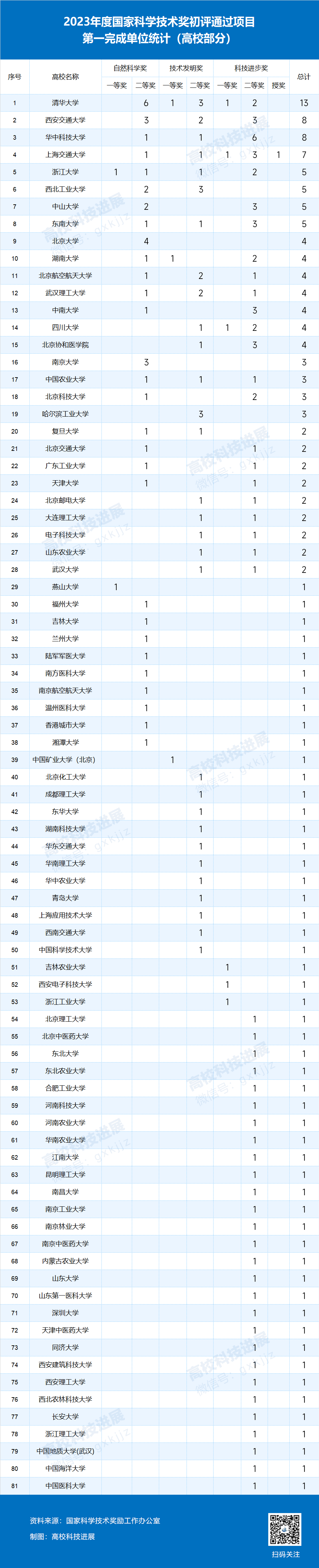 据统计,通过初评的通用项目中,高校作为第一完成单位的项目共计167项(各高校附属医院、附属机构等纳入所属高校统计),其中清华大学13项,西安交通大学和华中科技大学各8项,上海交通大学、浙江大学、西北工业大学、中山大学及东南大学均有5项及以上。
