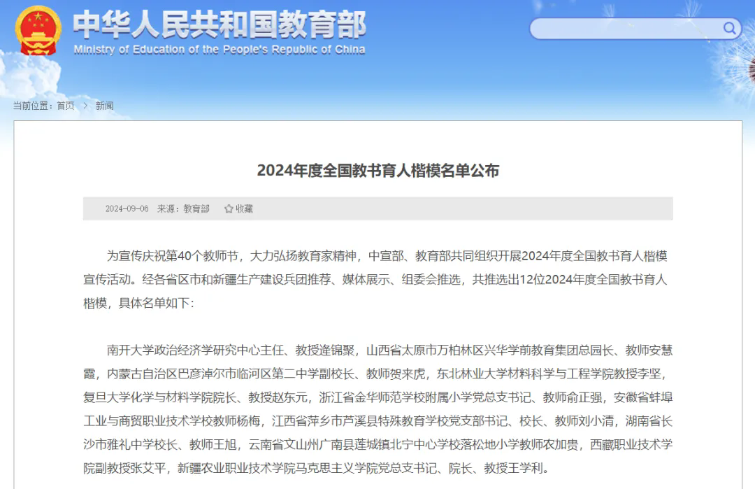 为宣传庆祝第40个教师节,大力弘扬教育家精神,中宣部、教育部共同组织开展2024年度全国教书育人楷模宣传活动。9月6日,教育部网站公布2024年度全国教书育人楷模名单,经各省区市和新疆生产建设兵团推荐、媒体展示、组委会推选,共推选出12位2024年度全国教书育人楷模。