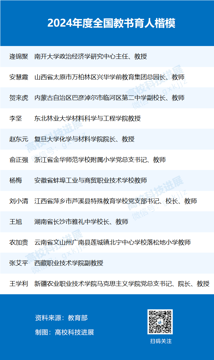 名单显示,高校共有5位教育工作者入选,分别是南开大学政治经济学研究中心主任、教授逄锦聚,东北林业大学材料科学与工程学院教授李坚,复旦大学化学与材料学院院长、教授赵东元,西藏职业技术学院副教授张艾平,新疆农业职业技术学院马克思主义学院党总支书记、院长、教授王学利。