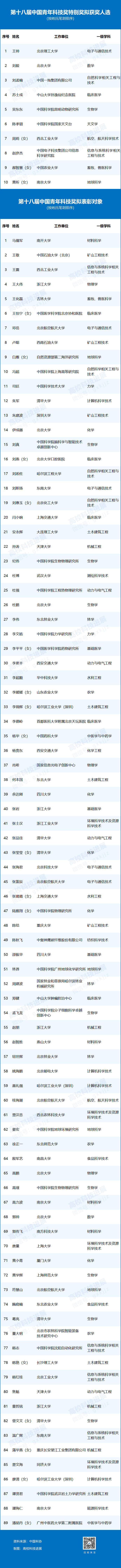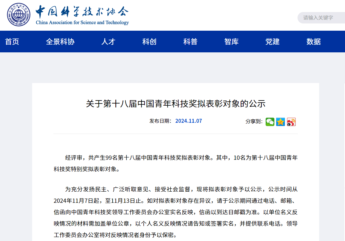 11月7日,中国科协网站发布《关于第十八届中国青年科技奖拟表彰对象的公示》,经评审,共产生99名第十八届中国青年科技奖拟表彰对象。其中,10名为第十八届中国青年科技奖特别奖拟表彰对象。公示时间为11月7日至13日。