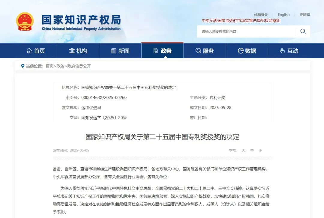 详细名单请点击:国家知识产权局关于第二十五届中国专利奖授奖的决定