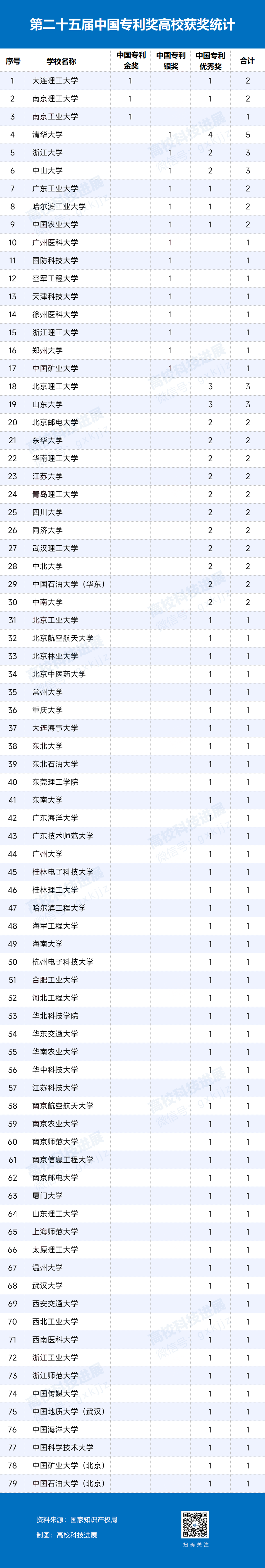 6月5日,国家知识产权局发布第二十五届中国专利奖授奖的决定。根据高校科技进展统计,在本届中国专利奖中,共有近80所高校的107个项目获奖。