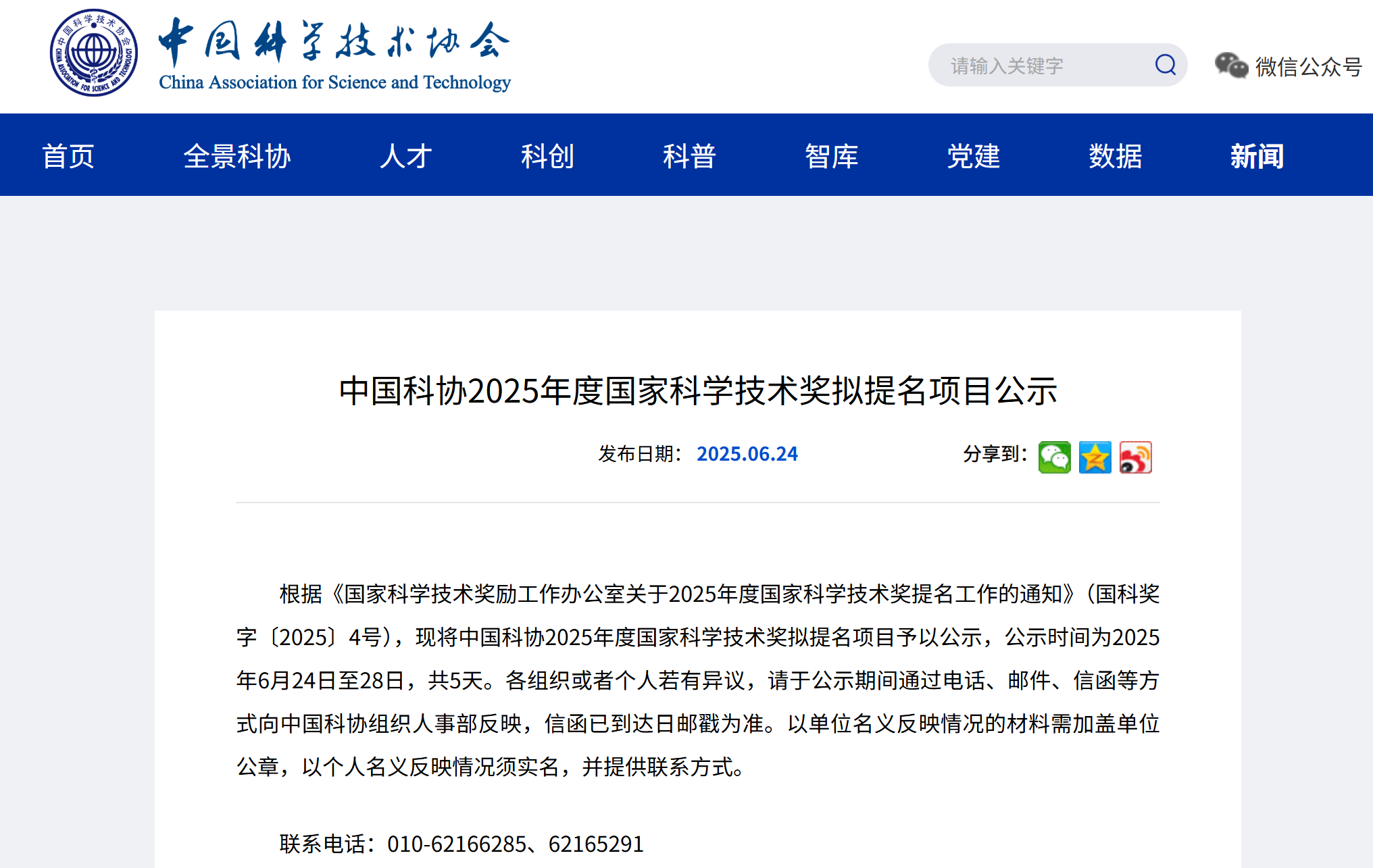 根据《国家科学技术奖励工作办公室关于2025年度国家科学技术奖提名工作的通知》(国科奖字〔2025〕4号),现将中国科协2025年度国家科学技术奖拟提名项目予以公示,公示时间为2025年6月24日至28日,共5天。各组织或者个人若有异议,请于公示期间通过电话、邮件、信函等方式向中国科协组织人事部反映,信函已到达日邮戳为准。以单位名义反映情况的材料需加盖单位公章,以个人名义反映情况须实名,并提供联系方式。