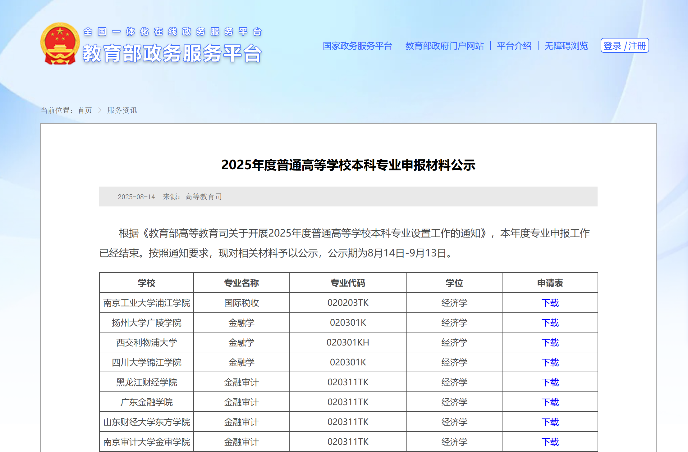 8月14日,教育部发布《2025年度普通高等学校本科专业申报材料公示》。根据《教育部高等教育司关于开展2025年度普通高等学校本科专业设置工作的通知》,本年度专业申报工作已经结束。按照通知要求,现对相关材料予以公示,公示期为8月14日-9月13日。