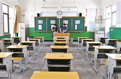 6月6日,在湖北省宜昌市秭归县第一中学考点,教师在布置考场。王辉富 摄