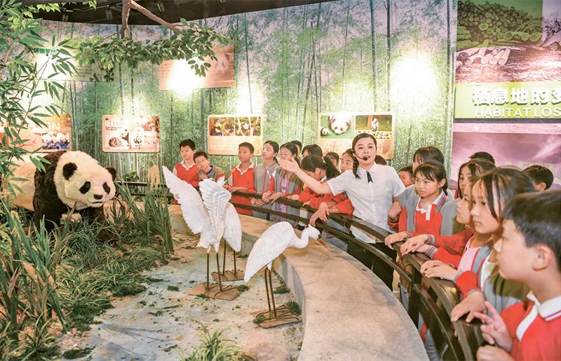 新时代以来,教育系统着力推动思想政治教育、专业教育与创新教育、社会实践、志愿服务等的融合。图为2024年5月17日,学生们在江西宜丰熊猫科技馆开展“行走的思政课”主题科普教育活动,增强节约资源和保护自然环境意识。(人民图片 周亮/摄)