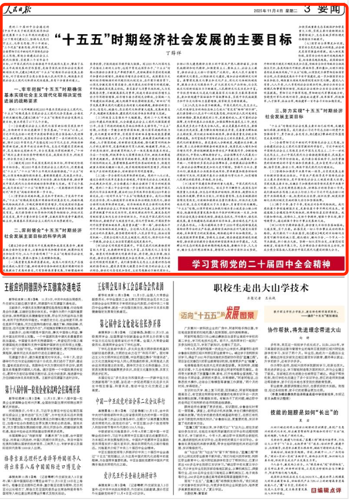 11月4日,《人民日报》要闻版刊发中共中央政治局常委、国务院副总理丁薛祥的署名文章,题为《“十五五”时期经济社会发展的主要目标》。