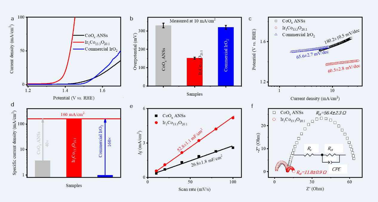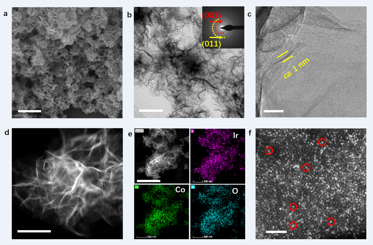 图1. 催化剂的结构表征。(a-c)CoOx NSs基底。其中内嵌图标示了选区衍射的扩散带。(d-f)Ir-CoOx NSs的结构表征。红圈标示出了Ir单原子。Ir/Co比例约为7:93,Ir原子载量约为20%的质量分数。