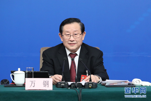 3月11日,十二届全国人大五次会议新闻中心举行记者会,邀请科技部部长万钢、秘书长徐建培就“2016年创新驱动发展战略实施进展成效和2017年重点工作”的相关问题回答中外记者的提问。图为科技部部长万钢。新华网/中国政府网 傅义洲 摄