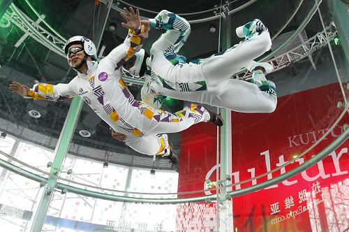 6月9日,一名游客(左)在教练的指导下体验“空中飞行”。