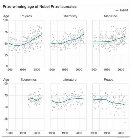 拿诺贝尔物理奖举例,现在获奖得主年龄基本都在65岁以后,而在上世纪时该奖项得主的平均年龄仅为47岁。事实上,从上世界50年代开始,在所有传统科学领域,都出现了诺贝尔奖得主年龄变老这样一种趋势,一直延续到了今天。