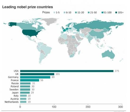 诺贝尔奖得主归属国家分部地图