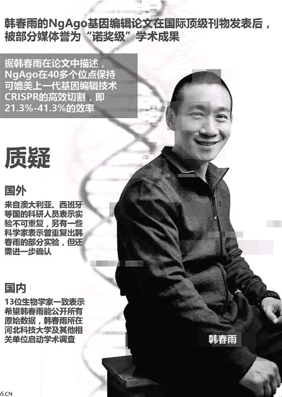 对于河北科技大学副教授韩春雨课题组在今年5月2日国际顶级期刊《自然-生物技术》上发表了NgAgo基因编辑技术的论文,此前一直都被认为是新一代基因编辑工具,可媲美有“基因魔剪”美称的CRISPR技术,甚至被国内部分媒体誉为“诺奖级”学术成果。由此,韩春雨和其实验室也获得了国内外的诸多赞誉与支持。