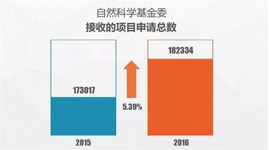 2016年,自然科学基金委共接收各类项目申请182334项,比去年的173017项增加5.39%。