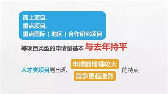 面上项目、重点项目、重点国际(地区)合作研究项目等项目类型的申请量基本与去年持平。人才类项目则呈现出申请数增幅较大、竞争更趋激烈的特点。