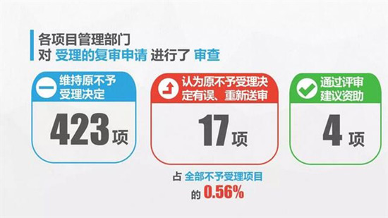 各项目管理部门对受理的复审申请进行了审查,维持原不予受理决定的423项;认为原不予受理决定有误、重新送审的17项,占全部不予受理项目的0.56%,其中4项通过评审建议资助。
