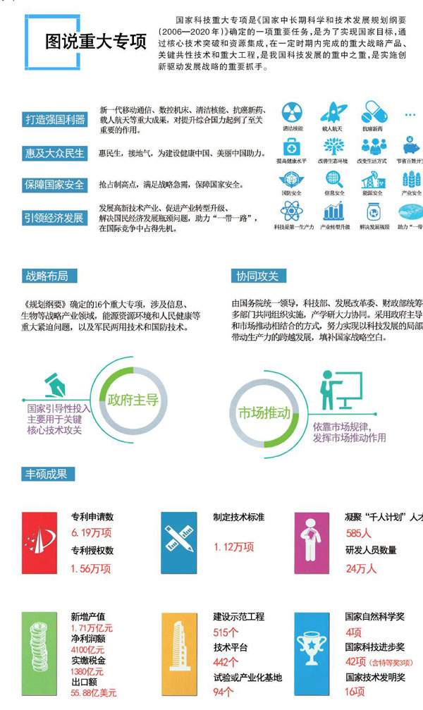 国家科技重大专项是《国家中长期科学和技术发展规划纲要(2006—2020年)》确定的一项重要任务,是为了实现国家目标,通过核心技术突破和资源集成,在一定时期内完成的重大战略产品、关键共性技术和重大工程,是我国科技发展的重中之重,是实施创新驱动发展战略的重要抓手。