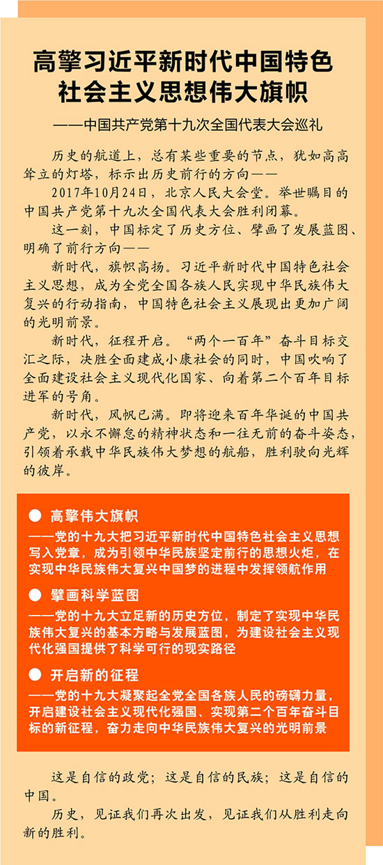 新华社北京10月24日电 题:高擎习近平新时代中国特色社会主义思想伟大旗帜——中国共产党第十九次全国代表大会巡礼