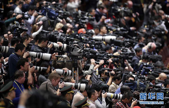 2017年10月18日,中国共产党第十九次全国代表大会在北京人民大会堂开幕。这是中外记者现场采访。新华社记者 丁林 摄