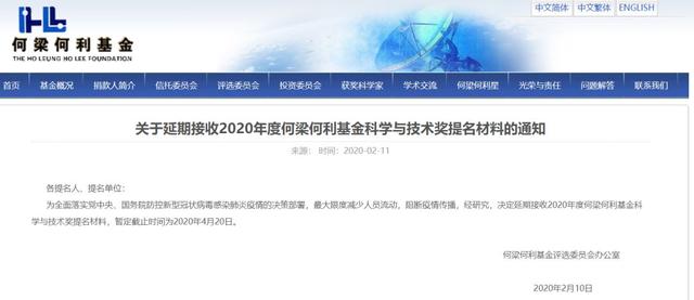 为全面落实党中央、国务院防控新型冠状病毒感染肺炎疫情的决策部署,最大限度减少人员流动,阻断疫情传播,经研究,决定延期接收2020年度何梁何利基金科学与技术奖提名材料,暂定截止时间为2020年4月20日。