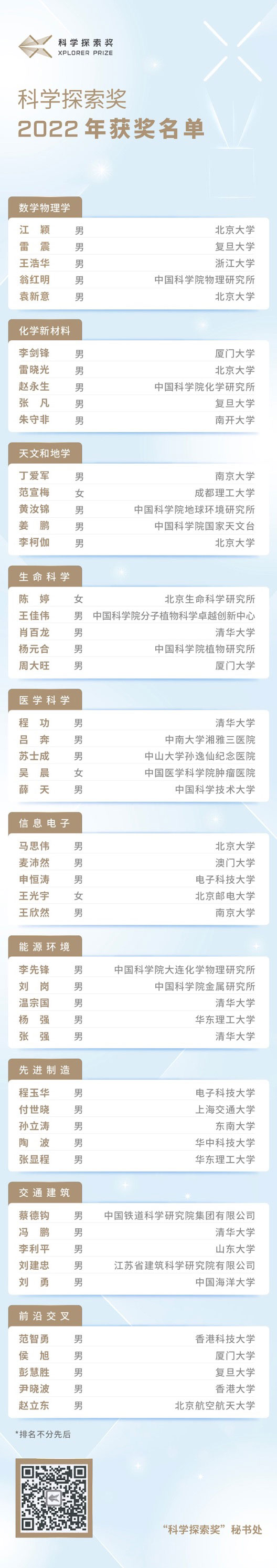 《中国科学报》注意到,50位获奖者中,最年轻的获奖人仅31岁,系北京邮电大学研究员王光宇,她也是“科学探索奖”首位“90后”获奖者。据记者了解,2022 年3月,王光宇刚刚入选第七届中国科协青年人才托举工程。