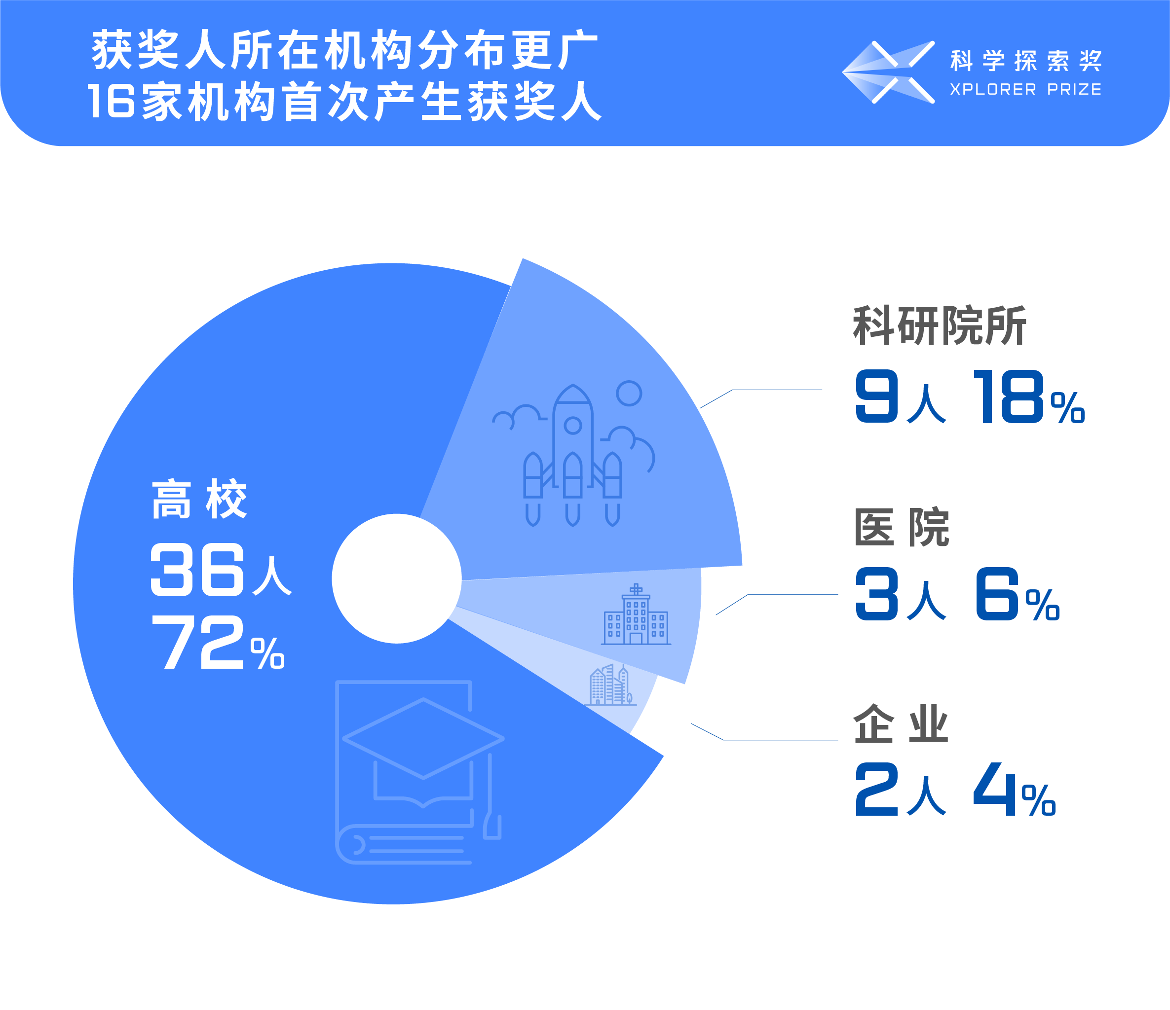 今年,“科学探索奖”获奖人来自35家不同机构,其中16家机构首次有人获奖。其中,中国科学院(含中国科学技术大学)依旧是“科学探索奖”重要的人才池:本届共有9位获奖者来自中科院,分布在天文和地学、生命科学、数学物理学等6个领域。位列其后的是北京大学、清华大学,两校各有5位获奖者入选。