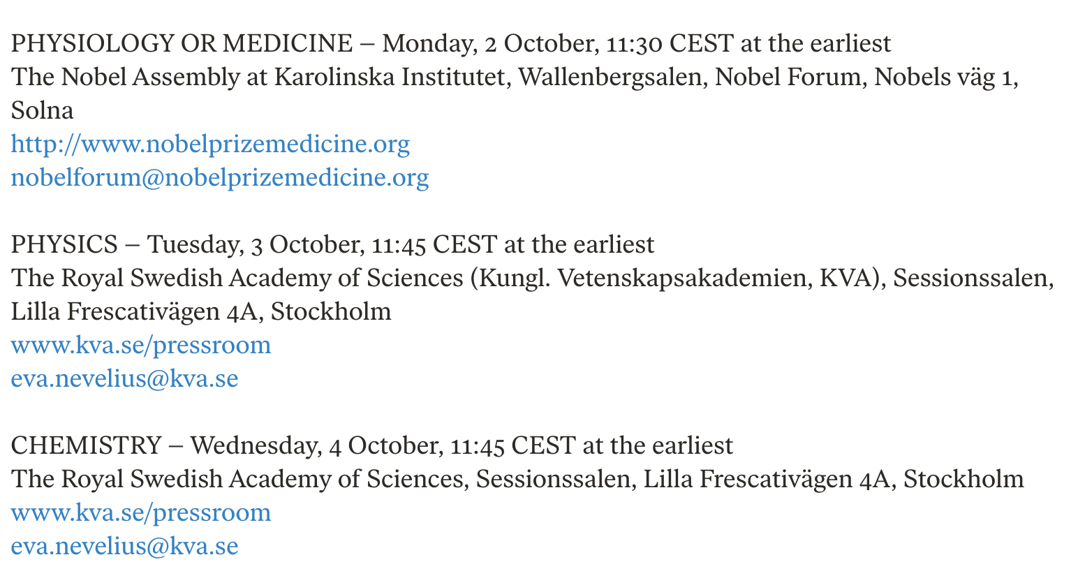 其中:10月2日,诺贝尔生理学或医学奖公布;10月3日,诺贝尔物理学奖公布;10月4日,诺贝尔化学奖公布。