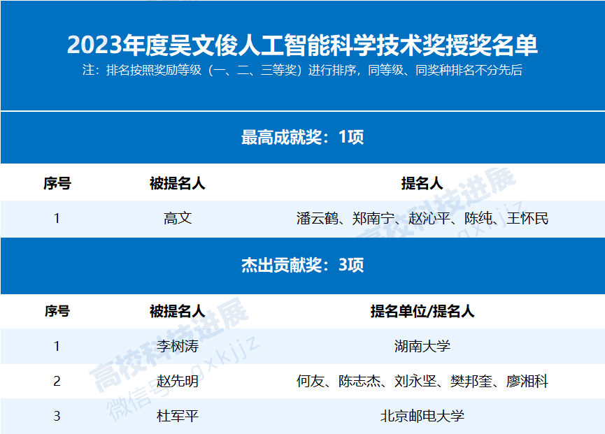 据悉,2023年度吴文俊人工智能科学技术奖共评出70个获奖项目成果,包括吴文俊人工智能最高成就奖1项、吴文俊人工智能杰出贡献奖3项、吴文俊人工智能自然科学奖6项、吴文俊人工智能技术发明奖6项、吴文俊人工智能科技进步奖14项、吴文俊人工智能专项奖(芯片项目)2项、吴文俊人工智能科技进步奖(科普项目)4项、吴文俊人工智能科技进步奖(企业技术创新工程项目)4项、吴文俊人工智能优秀青年奖15项、吴文俊人工智能优秀博士学位论文获奖论文10篇、吴文俊人工智能优秀博士学位论文提名论文5篇。