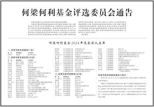 何梁何利基金是香港爱国金融实业家何善衡、梁銶琚、何添、利国伟先生于1994年3月30日捐资创立的、以奖励中华人民共和国杰出科技工作者为宗旨的科技奖励基金。依据《评选章程》规定的“公平、公正、公开”评选原则,经过提名推荐、专业评审、考察听证、终评审定的既定程序,经评选委员会全体会议评选决定,2024年度有1名为我国科技进步与创新作出卓越贡献的杰出科技工作者,荣获“何梁何利基金科学与技术成就奖”,授予证书、奖金100万港元;33名在科学技术领域取得重大发明、发现和科技成果的优秀科技工作者,荣获“何梁何利基金科学与技术进步奖”,各授予证书、奖金20万港元;22名具有高水平科技成就,通过技术创新和管理创新,创造重大经济效益和社会效益的优秀科技工作者,荣获“何梁何利基金科学与技术创新奖”,各授予证书、奖金20万港元。