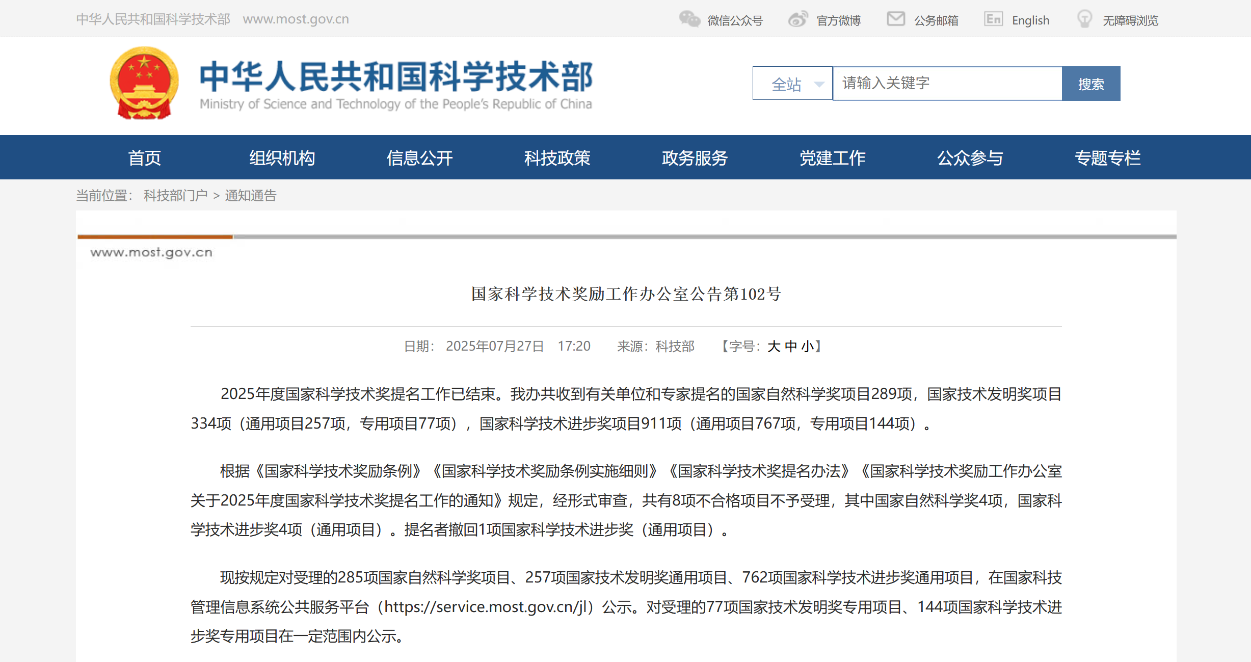 7月27日,国家科学技术奖励办公室发布第102号公告。公告内容如下: