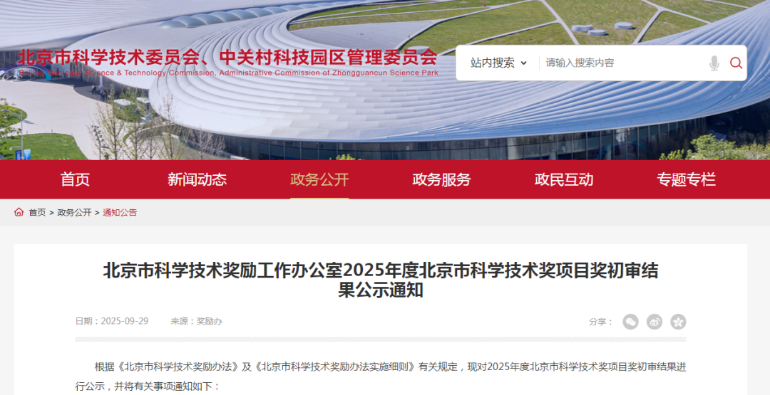 北京市科学技术奖励工作办公室2025年度北京市科学技术奖项目奖初审结果公示通知
