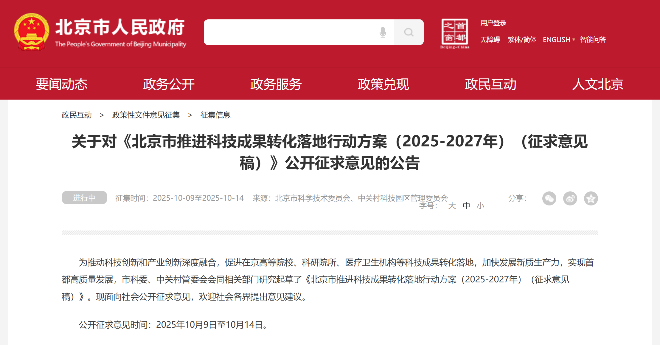 关于对《北京市推进科技成果转化落地行动方案(2025-2027年)(征求意见稿)》公开征求意见的公告