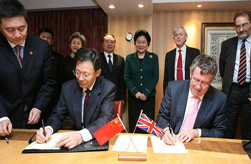 11月17日,科学技术部党组书记、副部长李学勇(前左二)与英国创新、大学和技能大臣德纳姆(前左三)在伦敦签署关于加强科学和创新领域全面合作与交流联合声明,国务委员刘延东(后右三)出席签字仪式。科学技术部还与英国研究理事会签署了进一步推进合作关系发展谅解备忘录。
