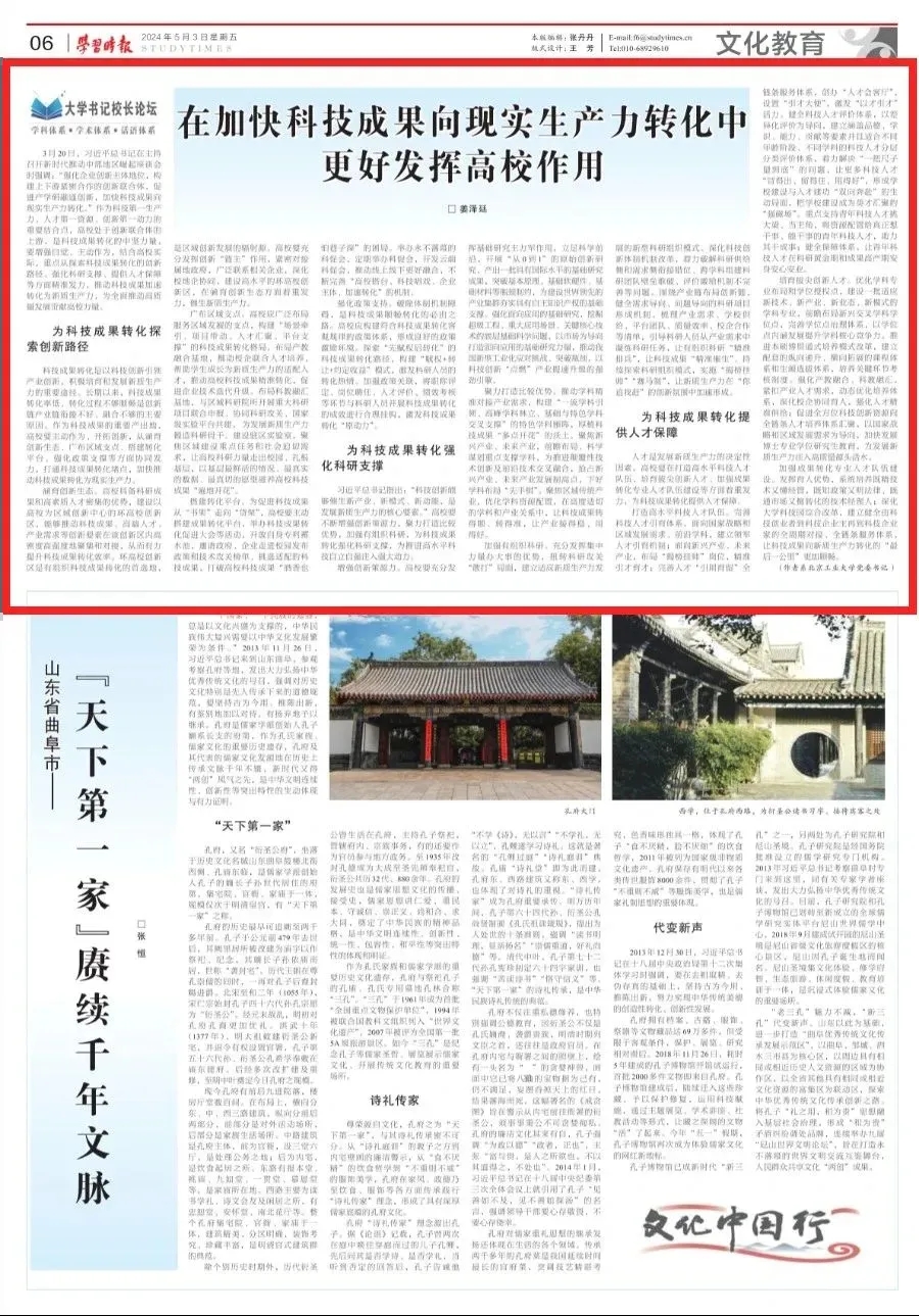 5月3日,《学习时报》刊发北京工业大学党委书记姜泽廷署名文章《在加快科技成果向现实生产力转化中更好发挥高校作用》。文章指出,高校作为科技第一生产力、人才第一资源、创新第一动力的重要结合点,处于创新联合体的上游,是科技成果转化的中坚力量,要增强自觉、主动作为,结合高校实际,重点从探索科技成果转化的创新路径、强化科研支撑、提供人才保障等方面精准发力,推动科技成果加速转化为新质生产力,为全面推动高质量发展贡献高校力量。