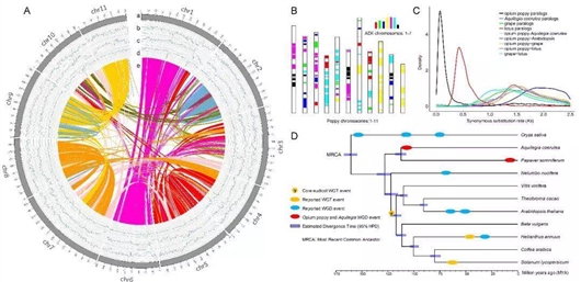 研究显示,罂粟基因组在距今780万年发生了一次全基因组加倍事件,在距今至少1.1亿年发生基因组片段加倍事件。此外,首次发现罂粟合成止咳那可丁和镇痛吗啡类生物碱的15个基因在11号染色体上形成超级基因簇,该基因簇在根、茎部特异表达且共表达。