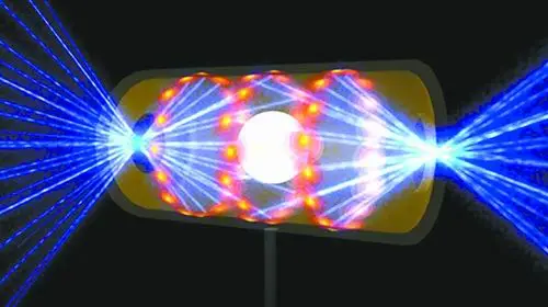 NIF的192束激光束进入一个橡皮擦大小的金圆柱体,从内部加热产生X射线,使燃料舱内爆,产生核聚变。图片来源:劳伦斯利弗莫尔国家实验室