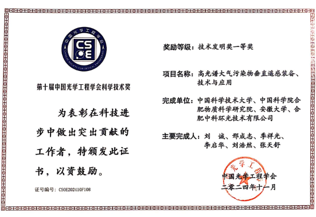大会开幕式上,第十届中国光学工程学会科学技术奖颁奖仪式隆重举行。由中国科大工程科学学院刘诚教授牵头,中国科学院合肥物质科学研究院、安徽大学、合肥中科环光技术有限公司等单位参与的“高光谱大气污染物垂直遥感装备、技术及应用”项目,荣获技术发明奖一等奖,中国科大刘诚教授为该成果的第一完成人。