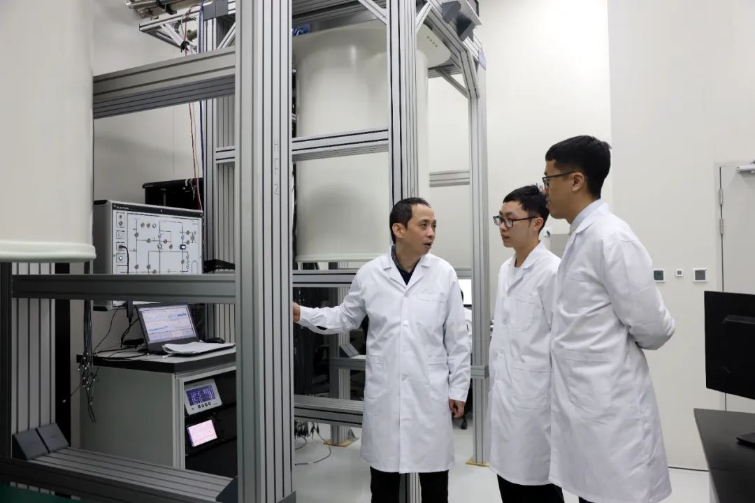 图:中国科大朱晓波(左)与学生讨论实验结果