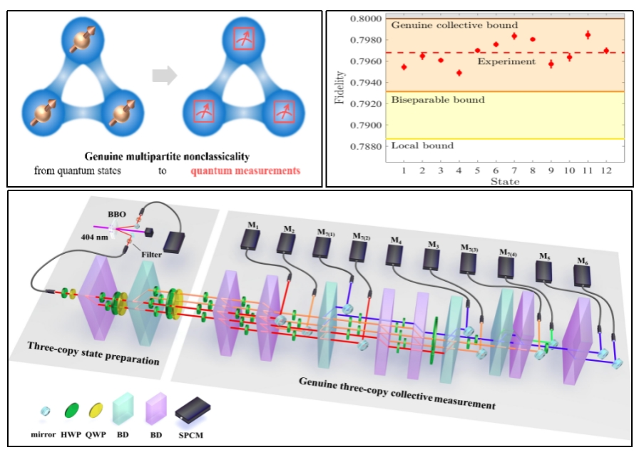 除了量子态,非经典关联也可以存在于量子测量中。量子集体测量相比可分测量具有更强的信息提取能力,即使被测量子体系子系统之间不存在任何关联。这种超越可分测量的信息提取能力只能来源于量子测量中的非经典关联。目前国际上已经实验实现了两拷贝集体测量,验证了两体非经典测量可以展现比可分测量更强的信息提取能力。但是相比于量子态中的真多体关联,如何判断一个测量是否具备真三体非经典关联尚不清楚,之前实验上也没有实现超越两拷贝集体测量信息提取能力的多拷贝集体测量。