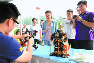 9月24日,北京市大学生创新创业教育成果展现场,观众们被北京信息科技大学的跳舞机器人吸引。 记者 和冠欣摄