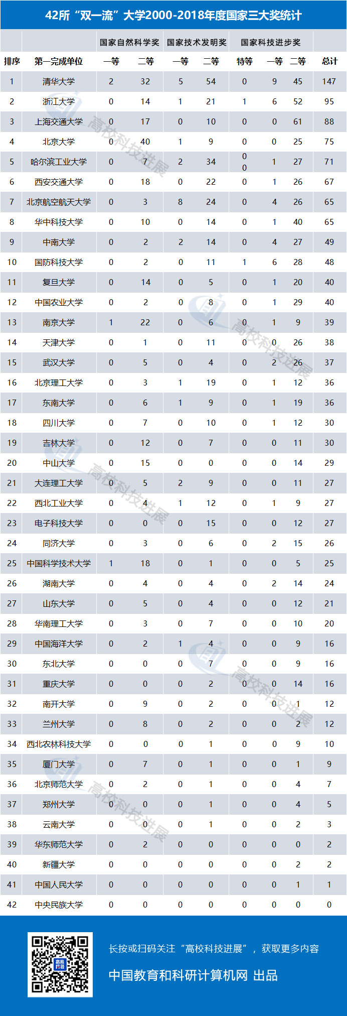 下图是42所“双一流”建设高校2000年至2018年国家“三大奖”(通用领域)的获奖情况,供高考学子志愿填报参考。