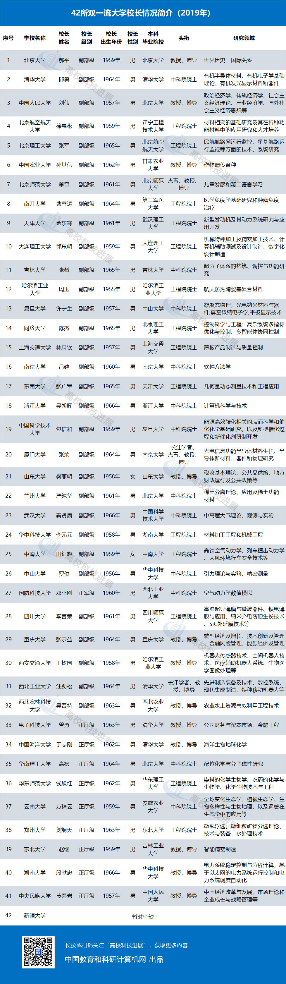 进入新时代以来,国家实施了世界一流大学和一流学科建设工程,简称“双一流”。在国家公布的世界一流大学建设名单中,首批入选的一共有42所大学,基本上囊括了我们熟知的中国顶尖高校。这42所“双一流”高校的校长中,有26位院士,院士占比61.9%,其中仅有两位女校长,校长们的研究领域按学科划分,覆盖理学、工学、生命科学、医学、社会科学五大领域。