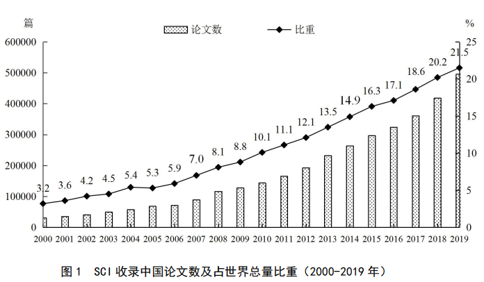 2019年,中国发表SCI论文49.6万篇,占世界总量的21.5%,比上年提升1.3个百分点。中国已连续第十一年排世界第2位。美国排名第一位,论文数量为59.0万篇,占世界总量的25.6%。