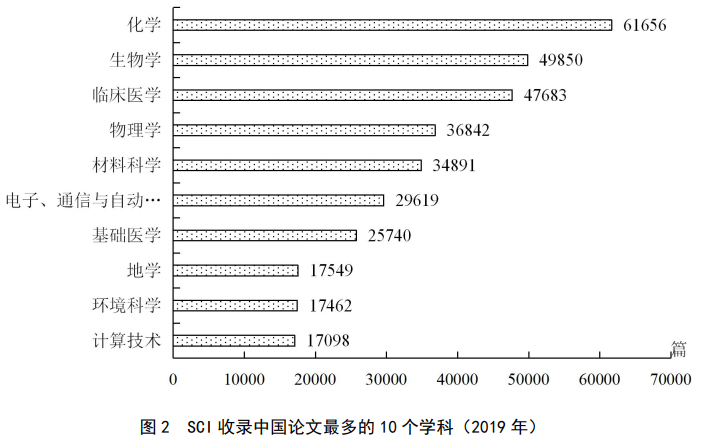 2019年,SCI收录中国论文数量排名前10位的学科分别为:化学,生物学,临床医学,物理学,材料科学,电子、通信与自动控制,基础医学,地学,环境科学和计算技术。这10个学科论文总量占到中国SCI论文总数的68.2%。其中化学学科论文数量仍居众学科之首,达到6.2万篇,占比为12.4%。