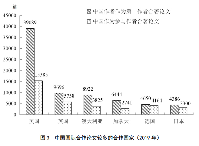 2019年,中国作者作为第一作者的国际合作论文共计9.6万篇,占中国全部国际合作论文的73.9%,合作伙伴涉及167个国家(地区)。合作伙伴排在前6位的国家分别是美国、英国、澳大利亚、加拿大、德国和日本。中国作者参与工作、其他国家作者作为第一作者的合作论文共3.4万篇,涉及190个国家(地区),合作伙伴排在前6位的国家分别是美国、英国、德国、澳大利亚、日本和加拿大。