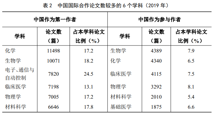 从学科分布看,中国国际合作论文主要集中在化学、生物学、物理学、临床医学、材料科学和电子、通信与自动控制等领域。2019年,中国作者作为第一作者的国际合作论文中,化学领域最多,为11498篇,占本学科论文的比例为17.2%。中国作者参与的国际合作论文中,生物学最多,为4389篇,占本学科论文的比例为7.9%。