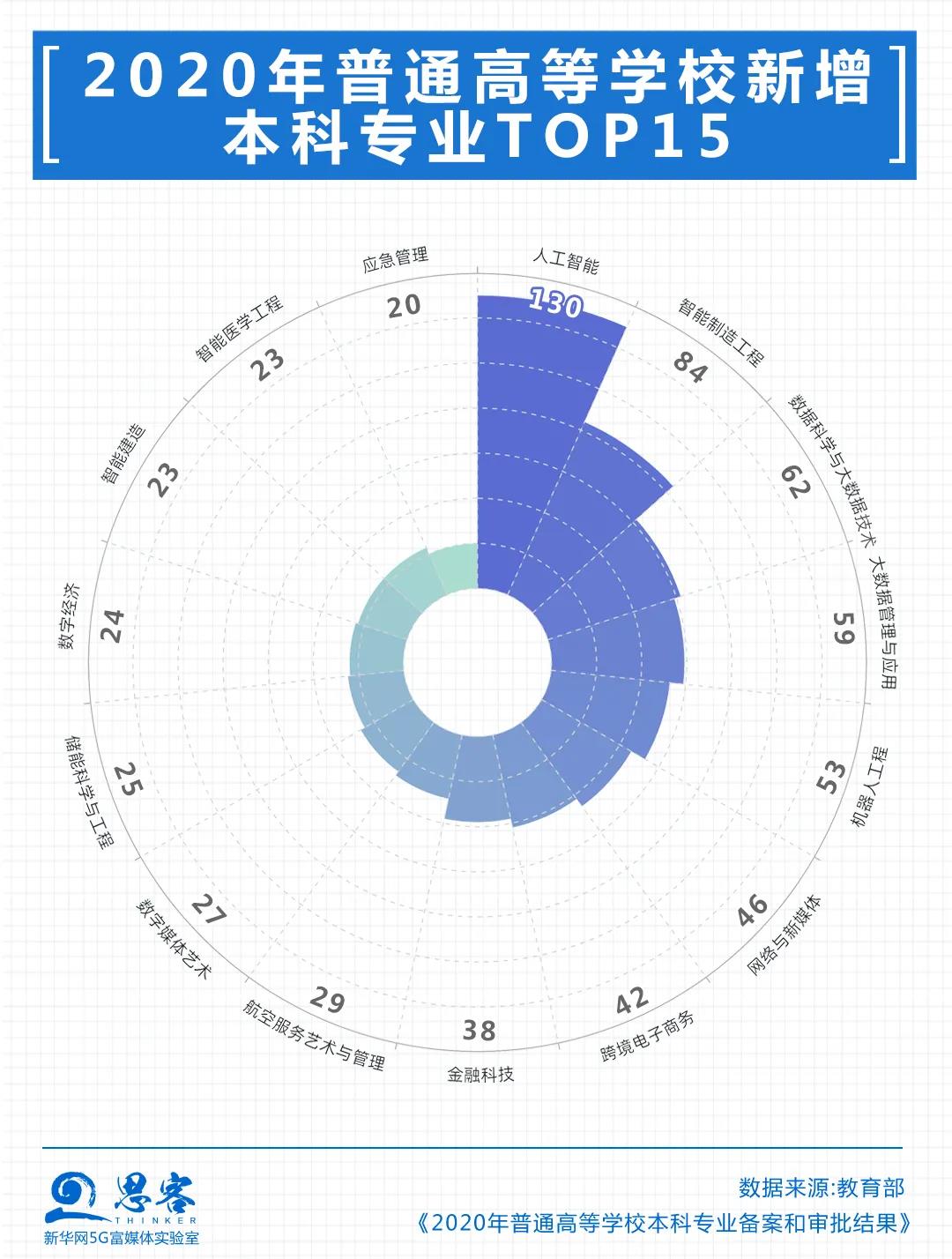 全国高校新增专业中,工学类专业新增比例最高,占据了12个专业门类新增数量的42%。2020年全国各高校新增专业2223个,其中,人工智能、智能制造工程、数据科学与大数据技术成为此次新增专业中的大热门,新增数量排名前三。仅人工智能一个专业,就有包括清华大学、北京语言大学、华北电力大学等在内的130所高校增设。