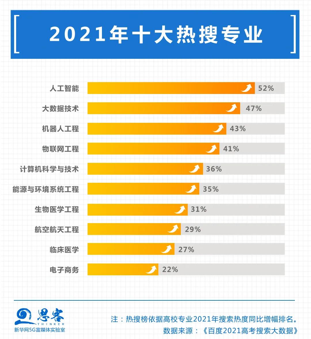 新兴专业人气十足,相关搜索热度持续升温。数据显示,人工智能、大数据技术、机器人工程受到考生们的热捧,成为搜索热度增长最快的专业,越来越多的考生考虑将未来职业规划锁定在高新技术产业领域。