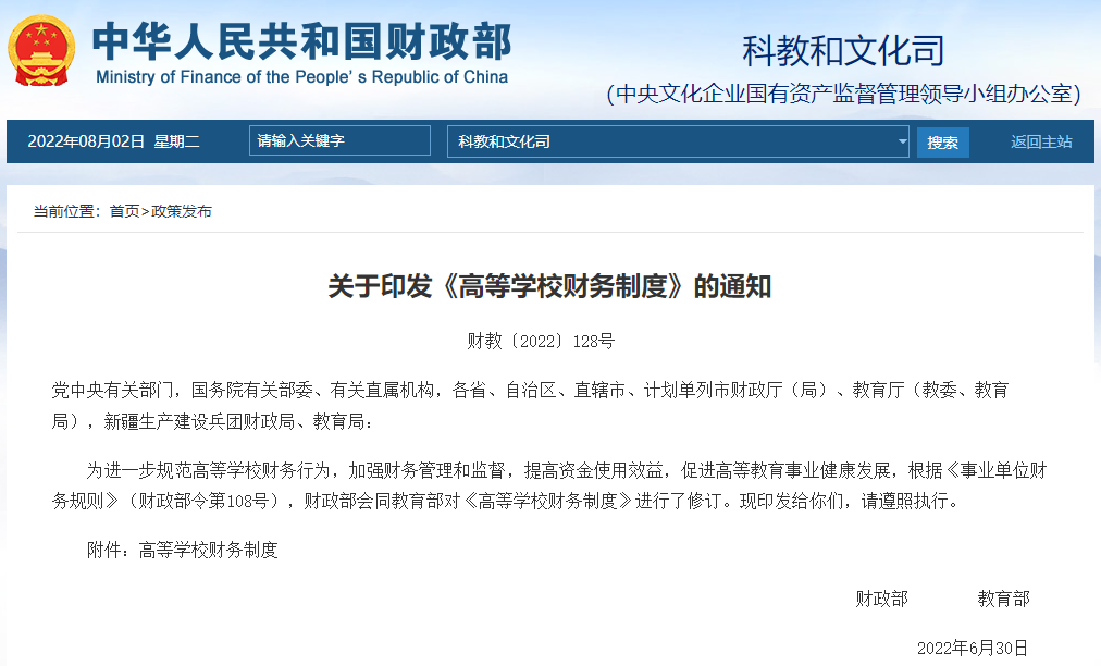 近日,财政部会同教育部修订印发《高等学校财务制度》(以下称《制度》),以进一步规范高等学校财务行为,加强财务管理和监督,提高资金使用效益,促进高等教育事业健康发展。